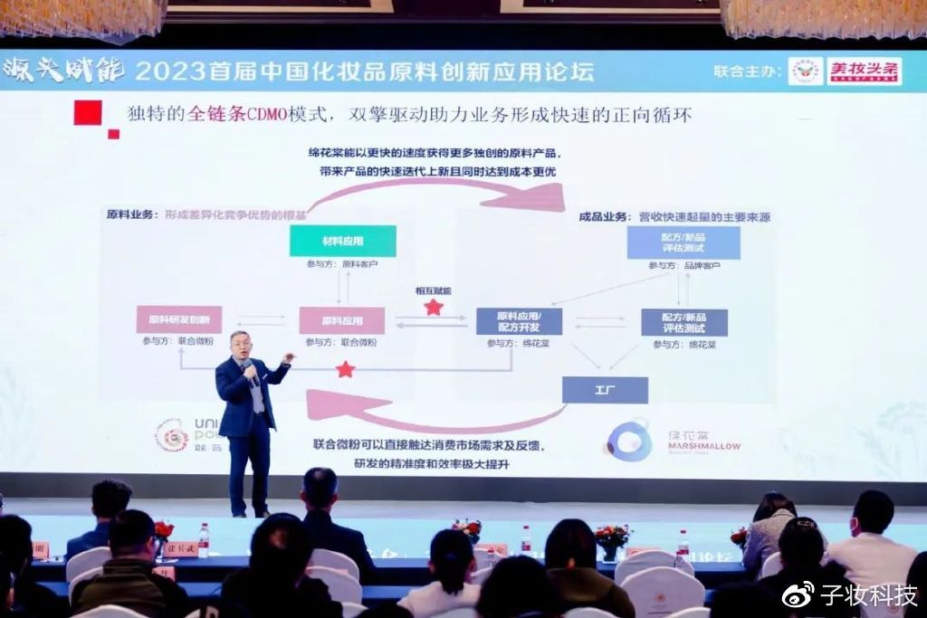 为了离市场更近,第一时间拿到市场反馈,联合微粉往下游延伸,在2021年成立了新型彩妆ODM工厂——绵花棠,并推出了独特的全链条CDMO模式,双擎互动驱动助力业务形成快速的正向循环。