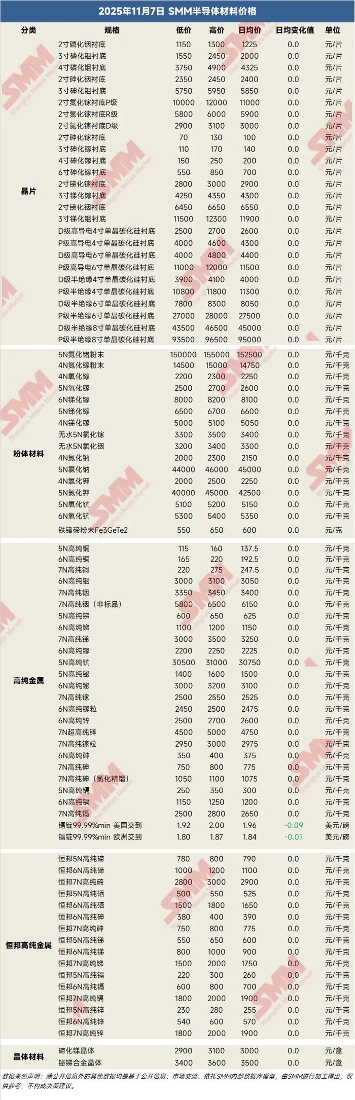 > 11.7:半导体材料价格(晶片、粉体材料、高纯金属)