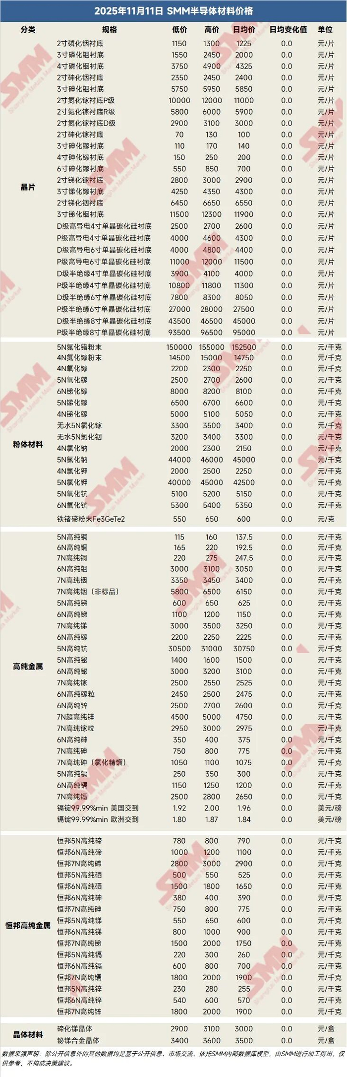11.11:半导体材料价格(晶片、粉体材料、高纯金属)