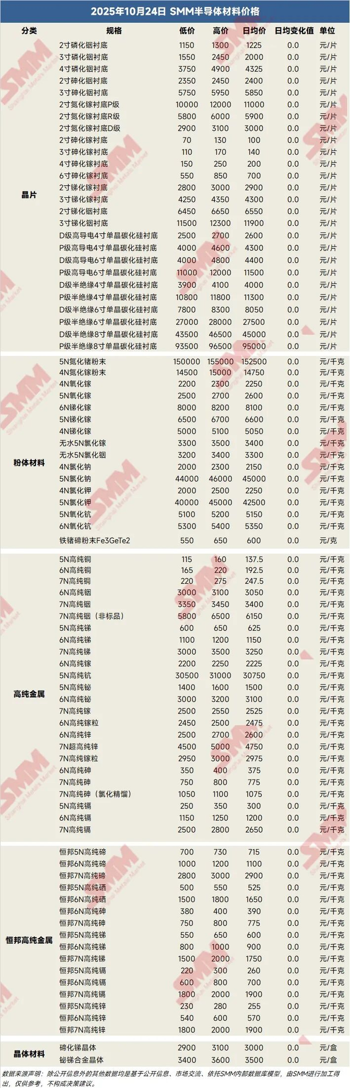 > 10.24:半导体材料价格(晶片、粉体材料、高纯金属)