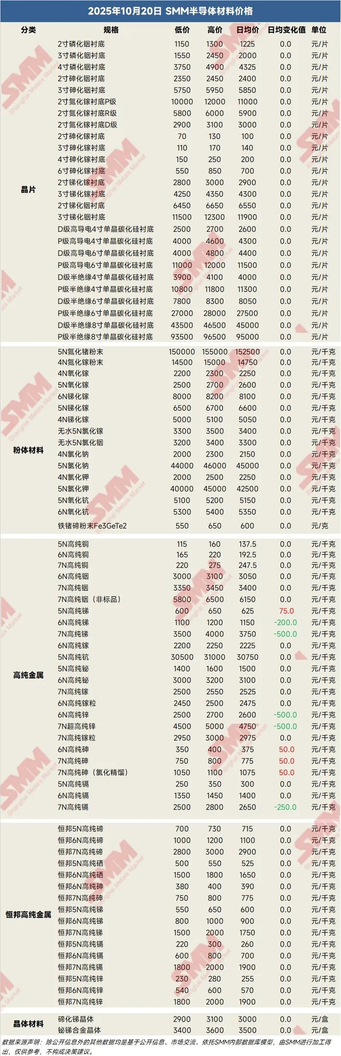 > 10.20:半导体材料价格(晶片、粉体材料、高纯金属)
